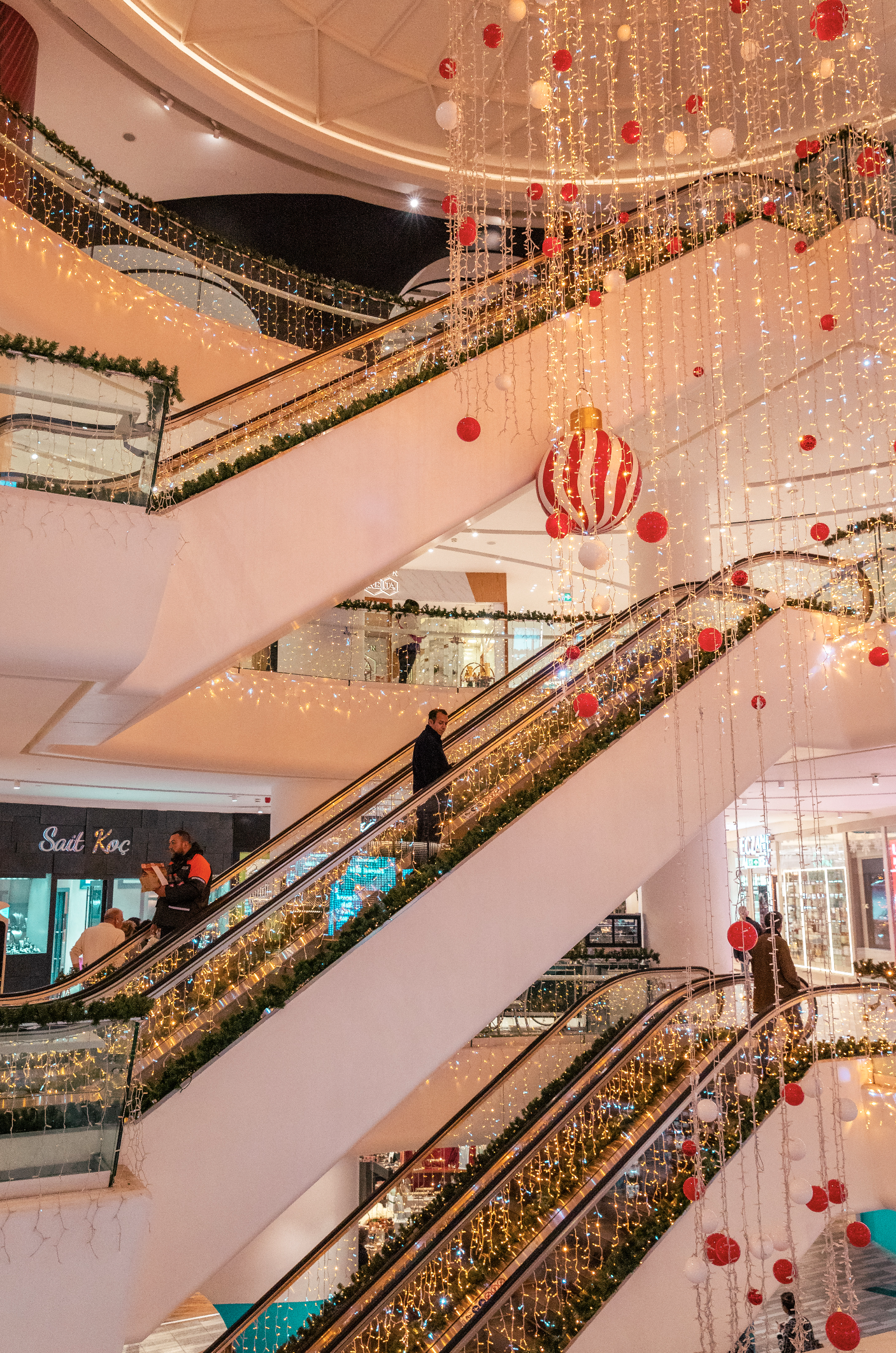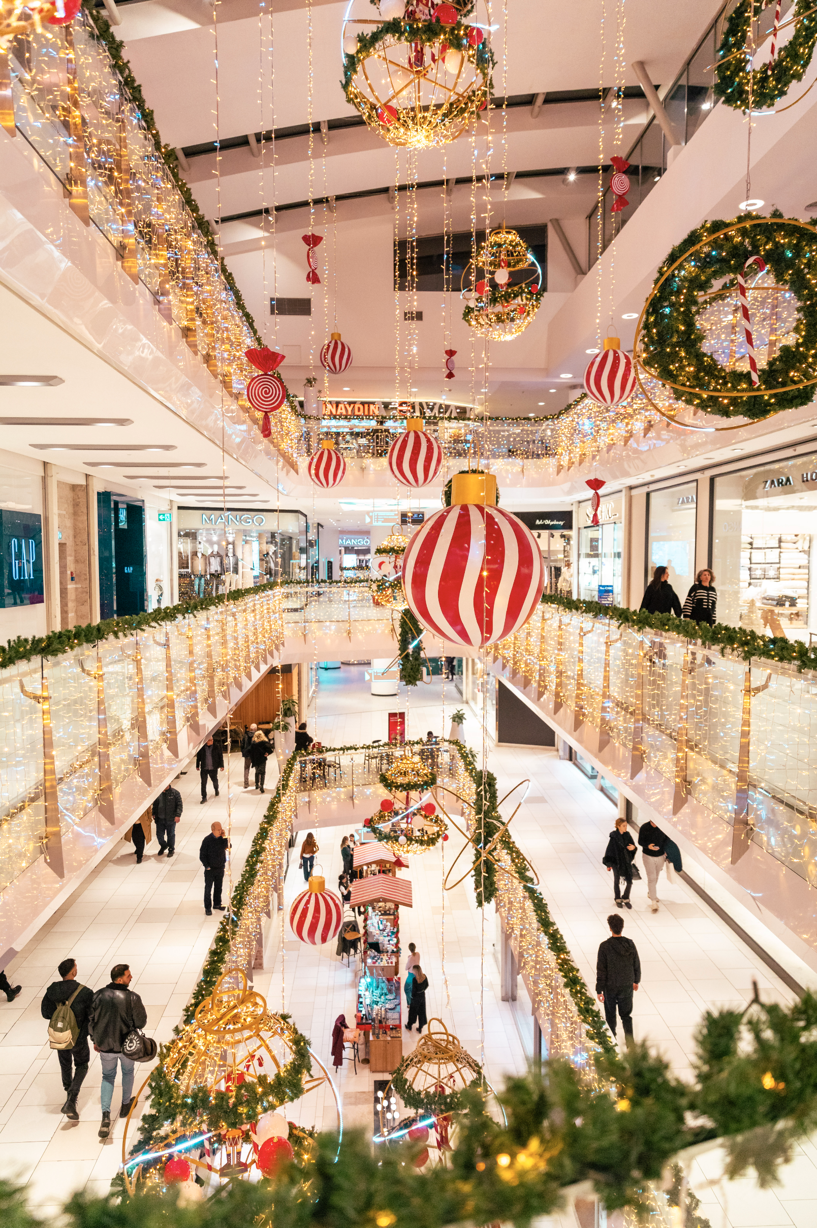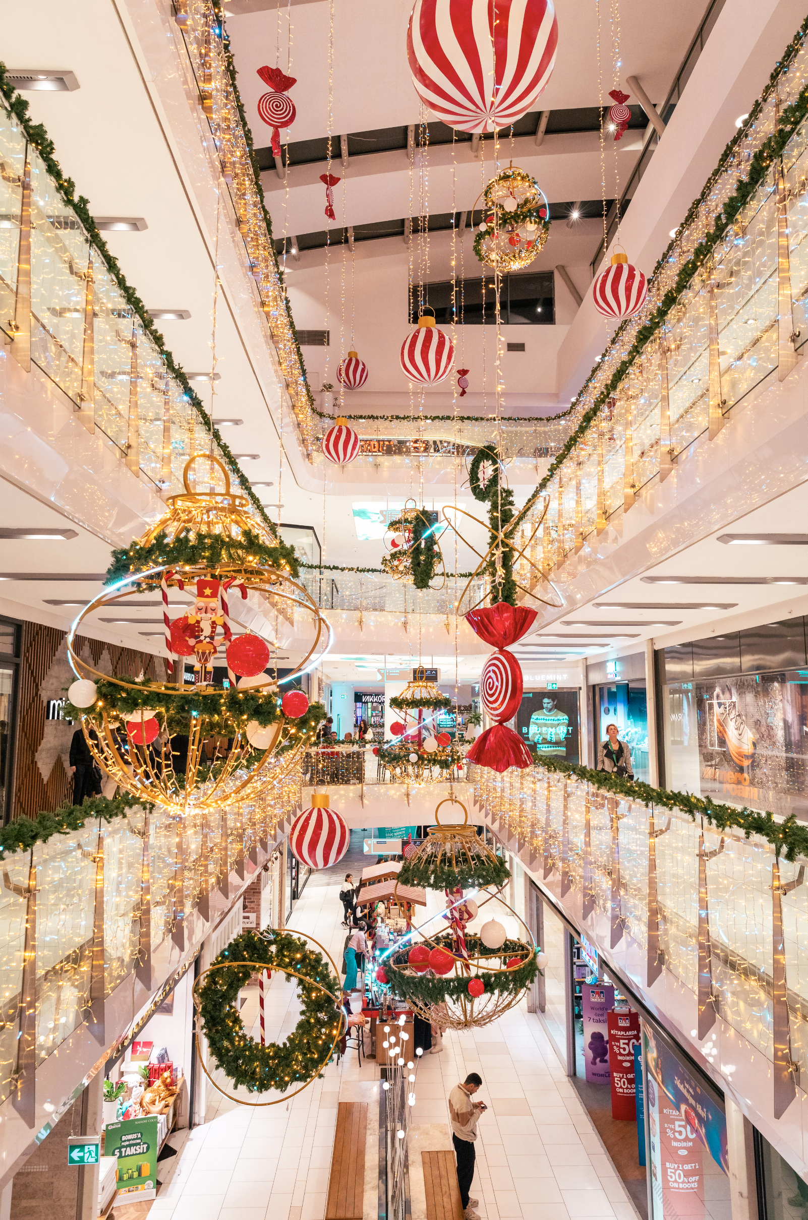 Joulun lähestyessä Akmerkez muuttuu lumoavaksi tilaksi, jossa joulun taika herää eloon ihastuttavassa ja elegantissa asetelmassa. Sisäänkäynnillä majesteettinen pyörivä puu, jota koristavat kimaltelevat joulupallot, punaiset nauhat ja karkkiaiheiset koristeet, lumoaa kävijöitä. Sekä sisällä että ulkona kultaiset köynnökset, valoisat ripustukset ja suuret koriste-elementit luovat lämpimän ja kutsuvan tunnelman. Jouluherkkuja muistuttavat kelluvat punaiset ja valkoiset pallot täydentävät hienostuneen ja juhlavan maiseman ja tarjoavat kävijöille unohtumattoman lomakokemuksen.